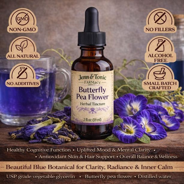 Our Butterfly Pea Flower Tincture is a vibrant herbal extract crafted with pure USP-grade vegetable glycerin to gently capture the essence of this remarkable botanical.